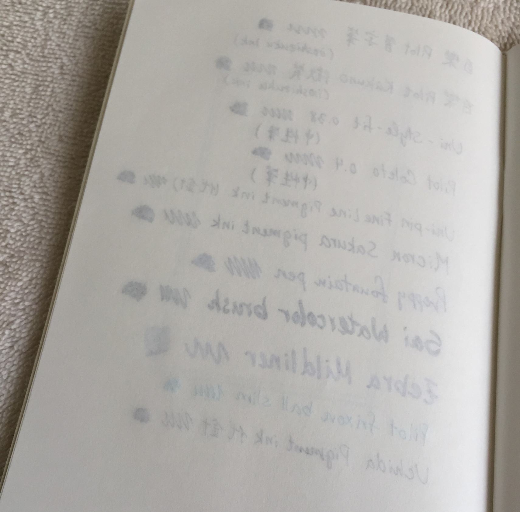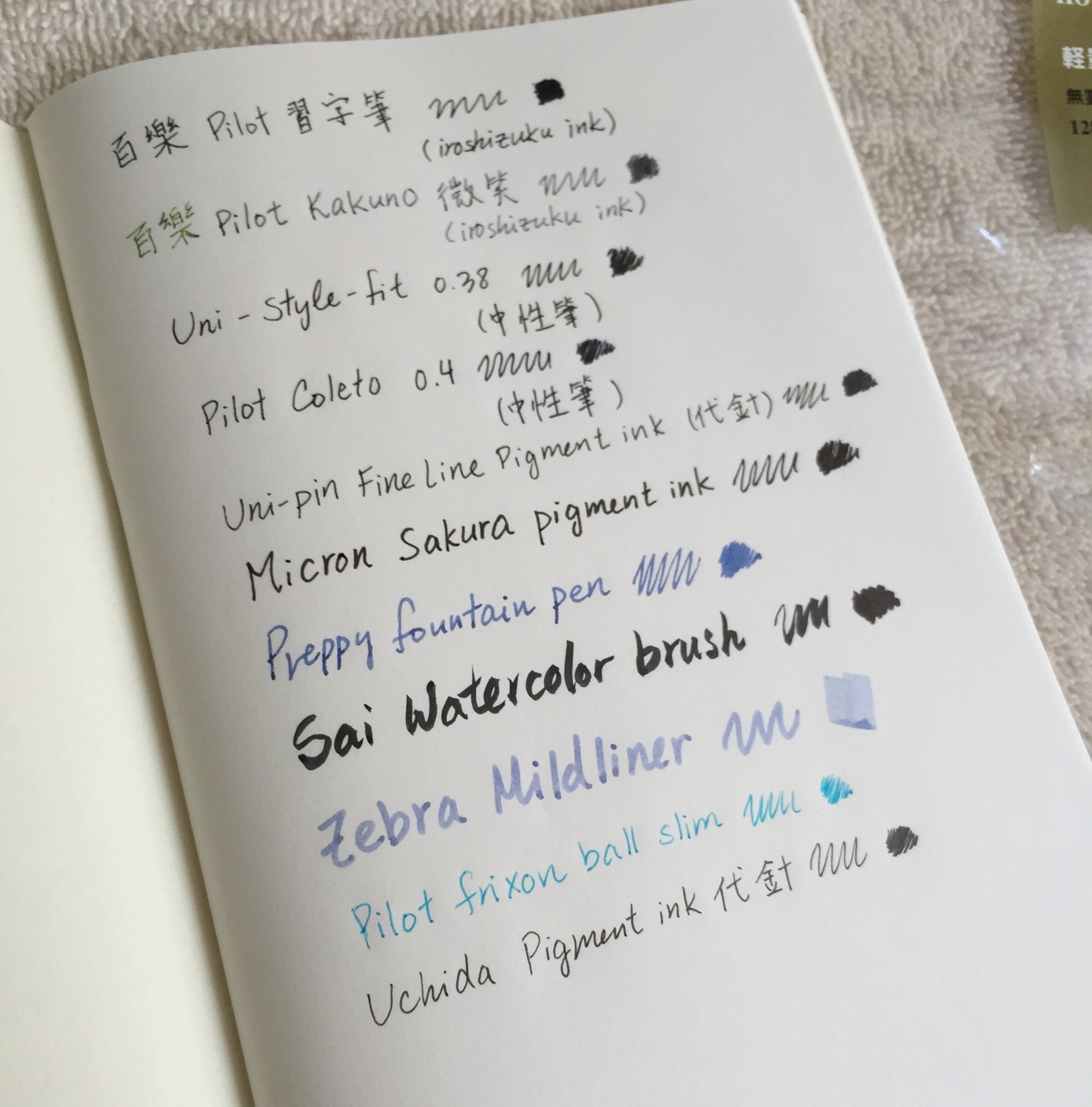 The top two are the Pilot Penmanship fountain pen, and Platinum Preppy. From left to right ( Pilot Kakuno, Uni pine fine line waterproof pigment pen, Pilot Coleto, Sai watercolor brush, Uchida waterproof pigment pen, Zebra Mildliner, Uni Signo 0.38, Sakura Micron pigment pen, Uni-style fit)