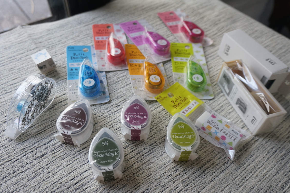 (Daiso Mosaic tape puller, VersaMagic chalk Ink, Petite Deco Rush & Eraser, mt Washi tape dispenser)