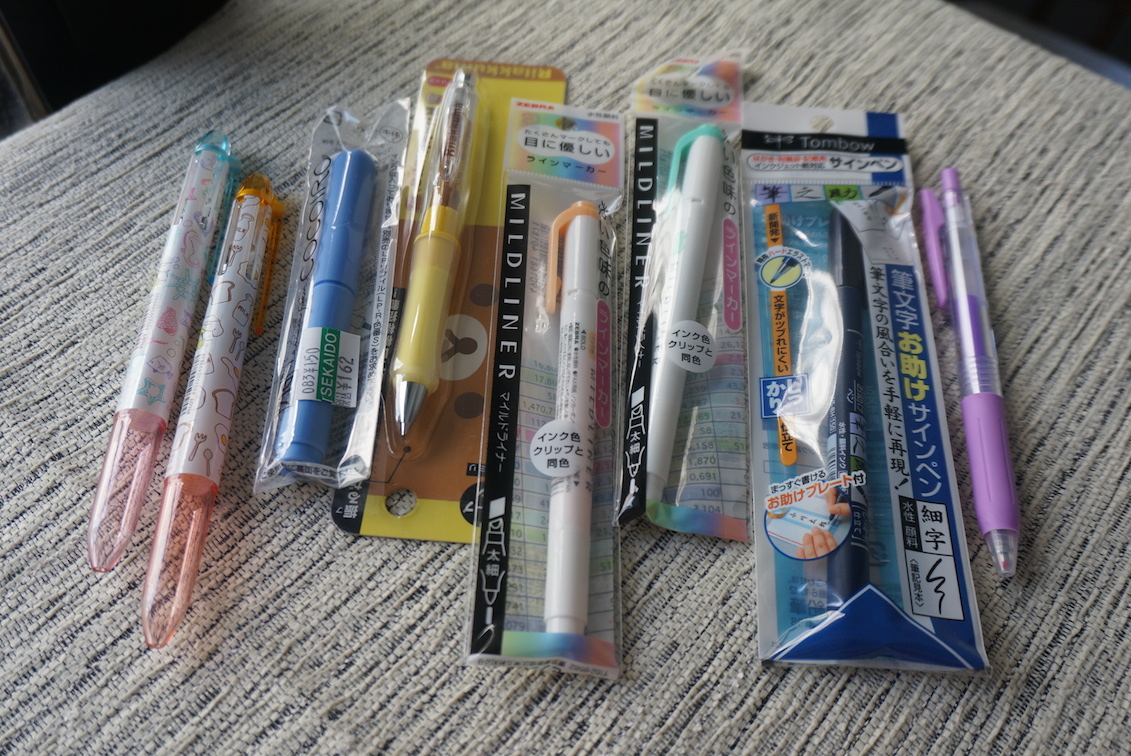 (Left to right: Pilot Coleto multi-catrige pen, Cocoiro, Dr. Grip mechanical pencil in Rilakkuma, Zebra Mildliners, Tombow double-sided permanent markers, Zebra Sarasa)