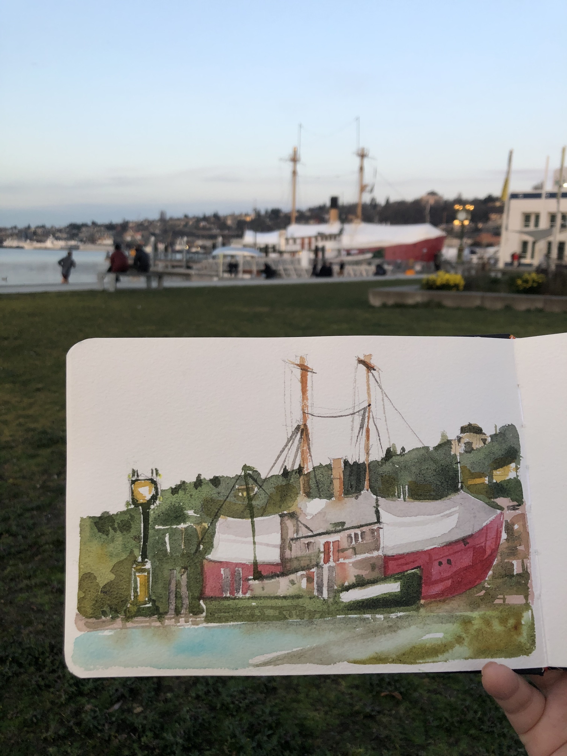 Speaking of my creative lifestyle. Here’s an update on my first urban sketching outing of the year 2021. I met up with my friend and fellow urban sketcher Swagatika at South Lake Union by MOHAI. We sat on a large bench in the park and enjoyed the beautiful sunset of a warm spring day.