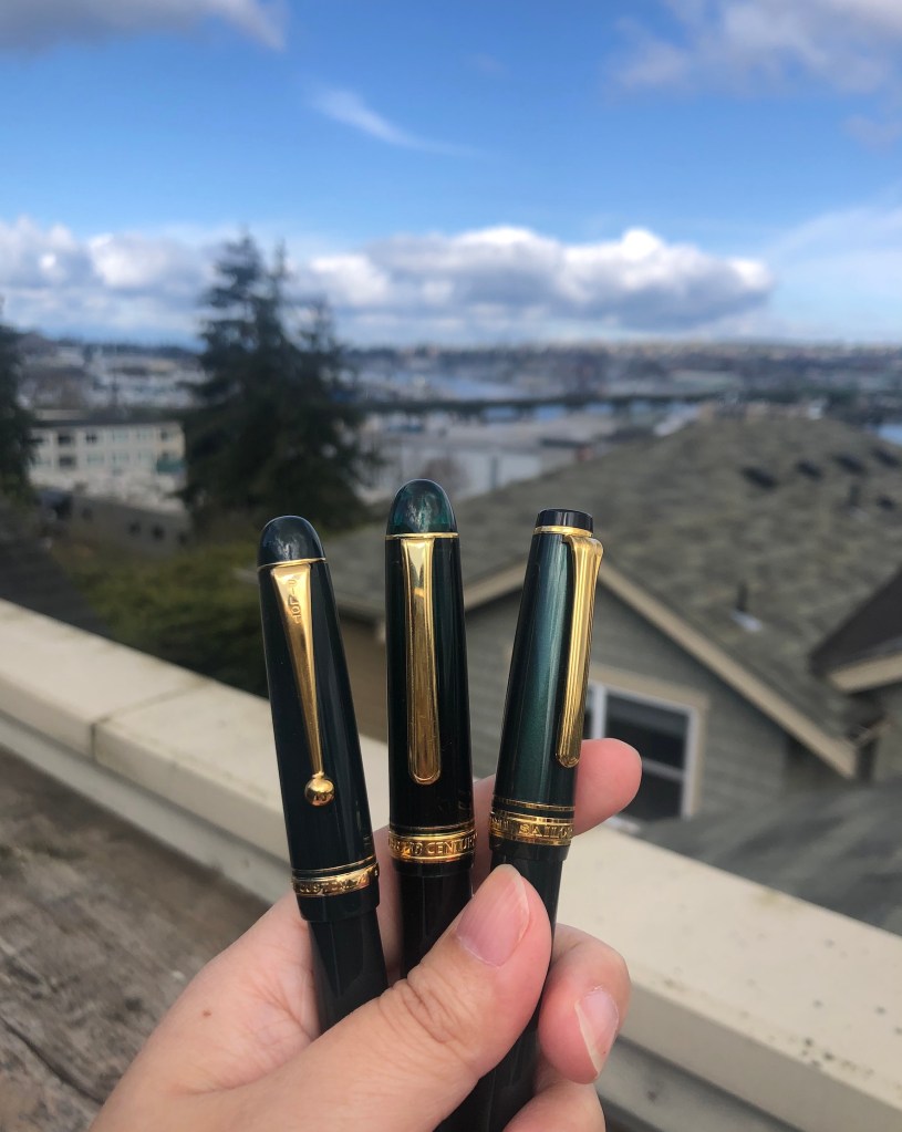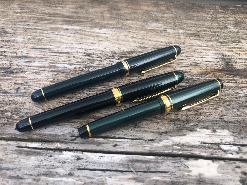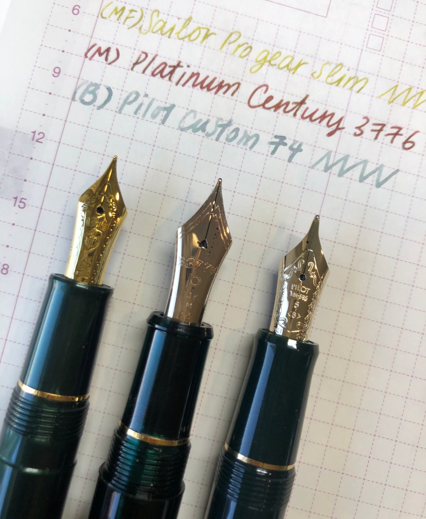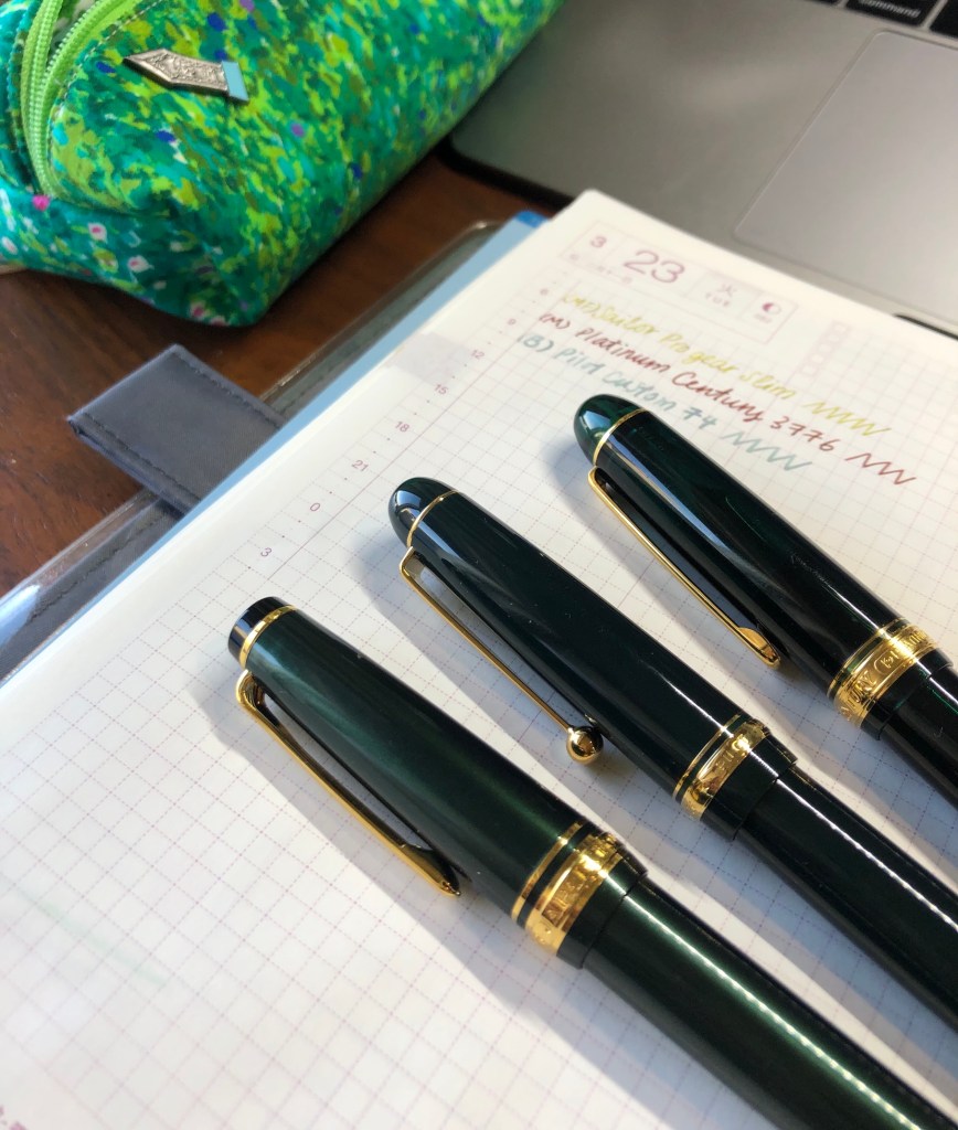 The final pen in this trio is the Pilot Custom 74 in dark green. Since I’m trying to collect “beginner’s gold nibs” from the three big Japanese stationery brands: Sailor, Platinum, and Pilot, my friend Kelly recommended Pilot’s Custom 74 to complete the trifecta. The dark green color way is no longer available from most US retailers, so I found a shop called Pensachi that was based in Japan! I chose a broad nib in this pen because I want to try something new since I already have many Pilot fountain pens in EF, F, and M.