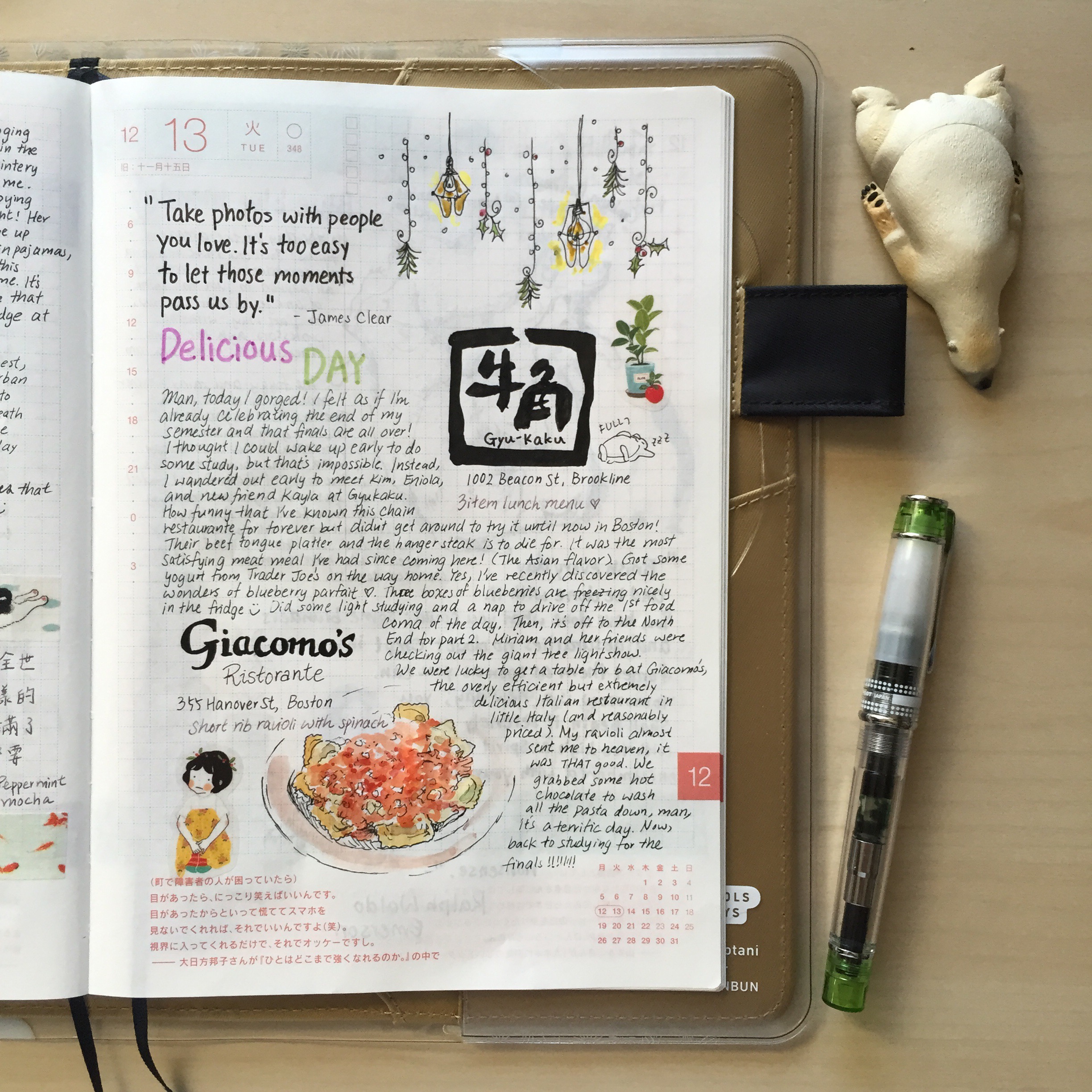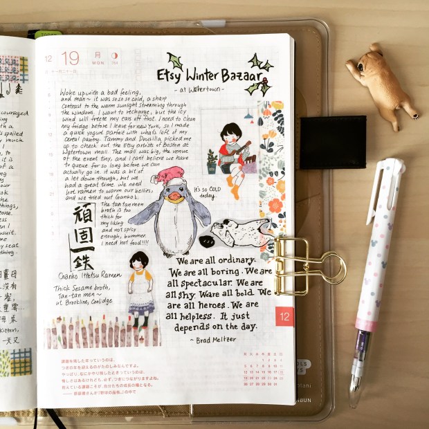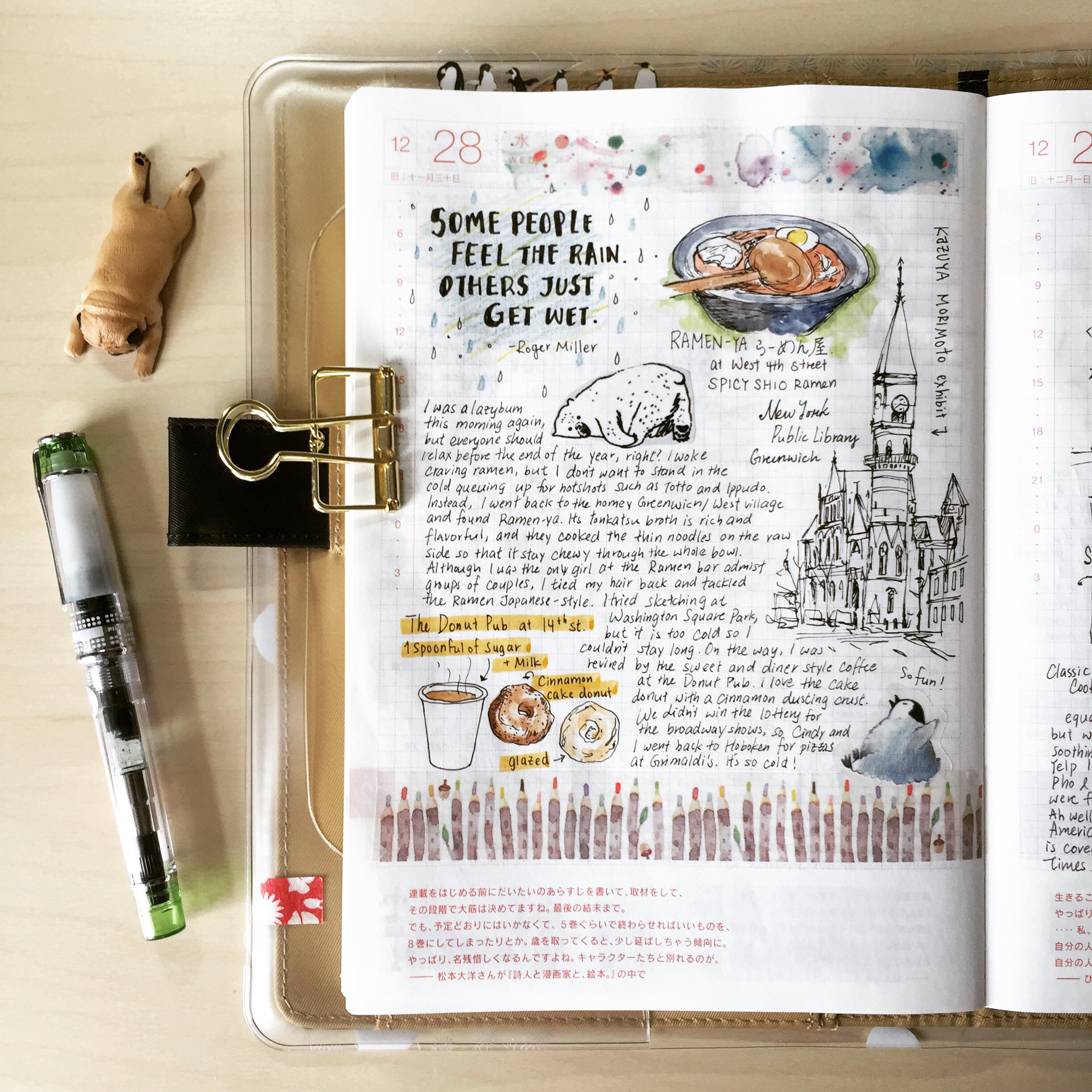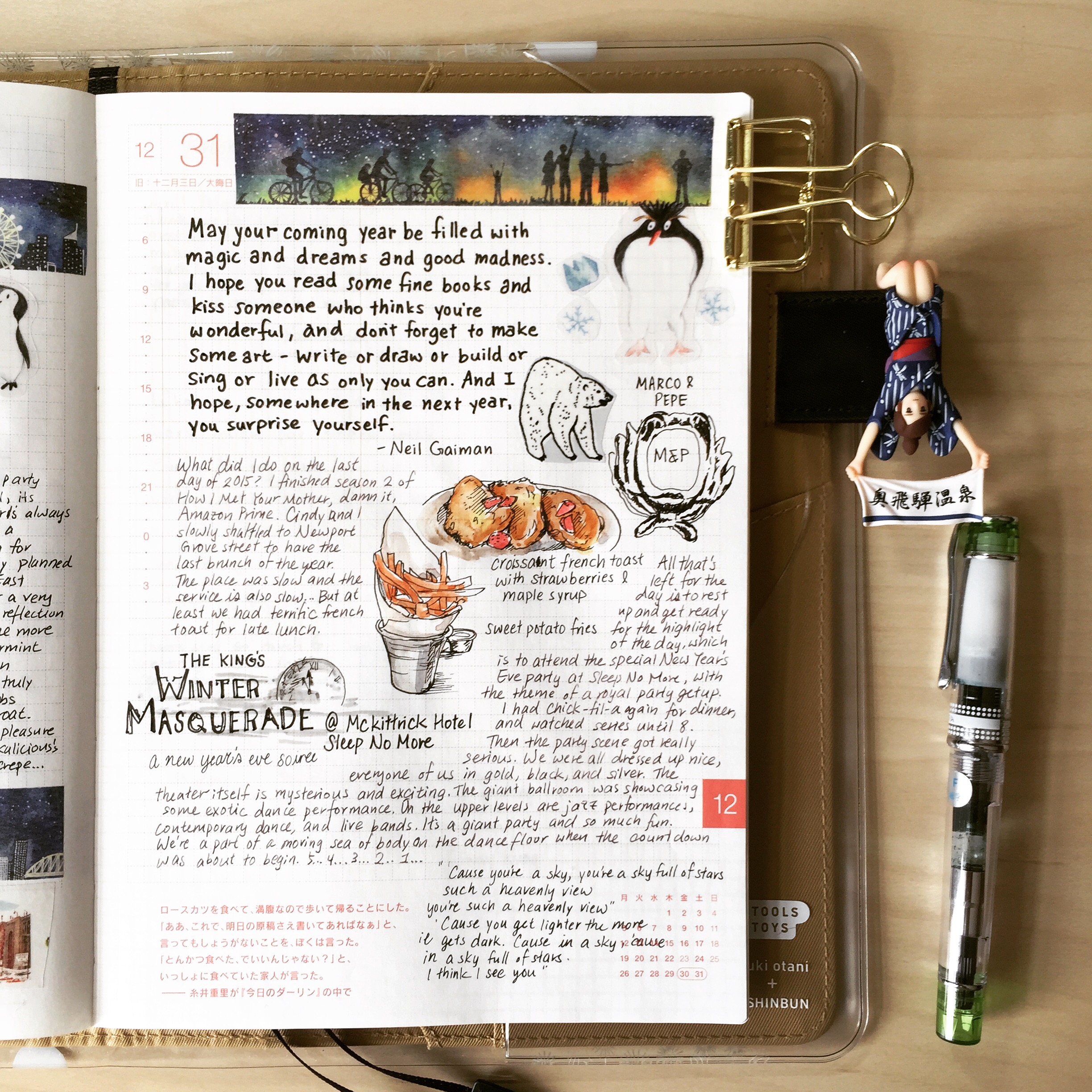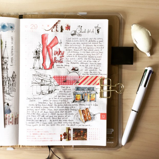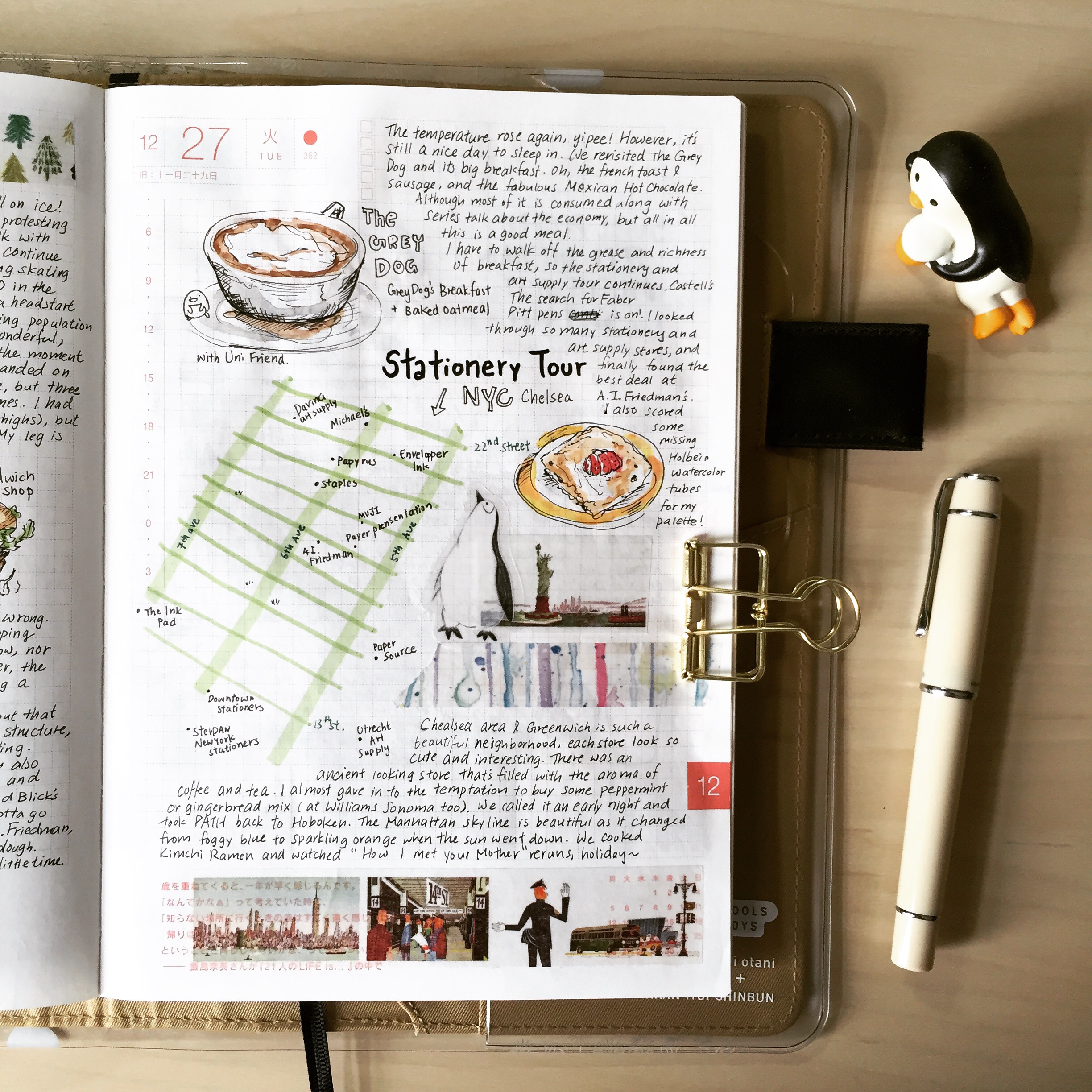 I do lots of my creative journaling in my Hobonichi, but I also love all other things stationery. That includes the Midori branded Traveler’s Notebooks (TN for short). My first traveler’s notebook was a full size to utilize inserts when I travel. I would fill it with sketches and journaling while on a trip such as this Tokyo flip through. However, I was inspired by many friends at meet ups to use the passport size traveler’s notebook as a portable journal/wallet!